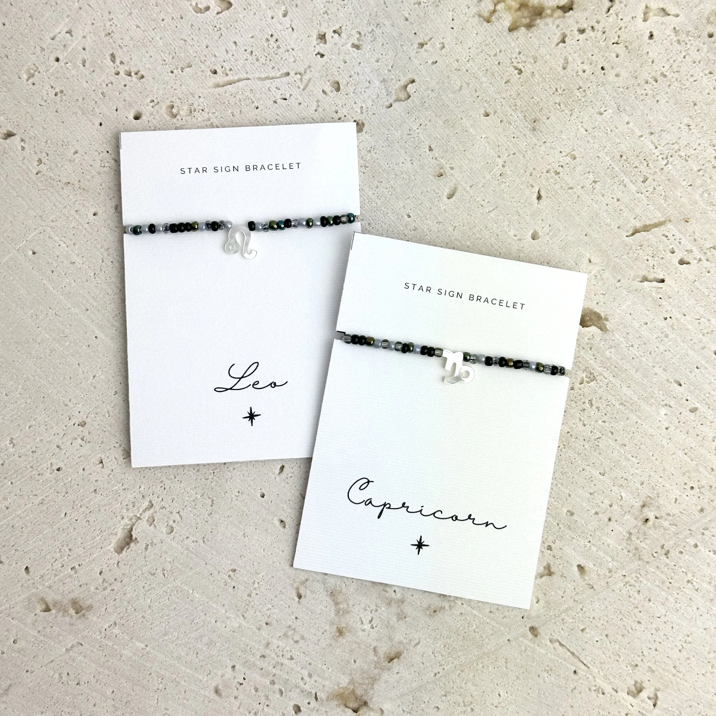 A giftable collection of star sign bracelets with mother of pearl charms on a iridescent beaded cord.
